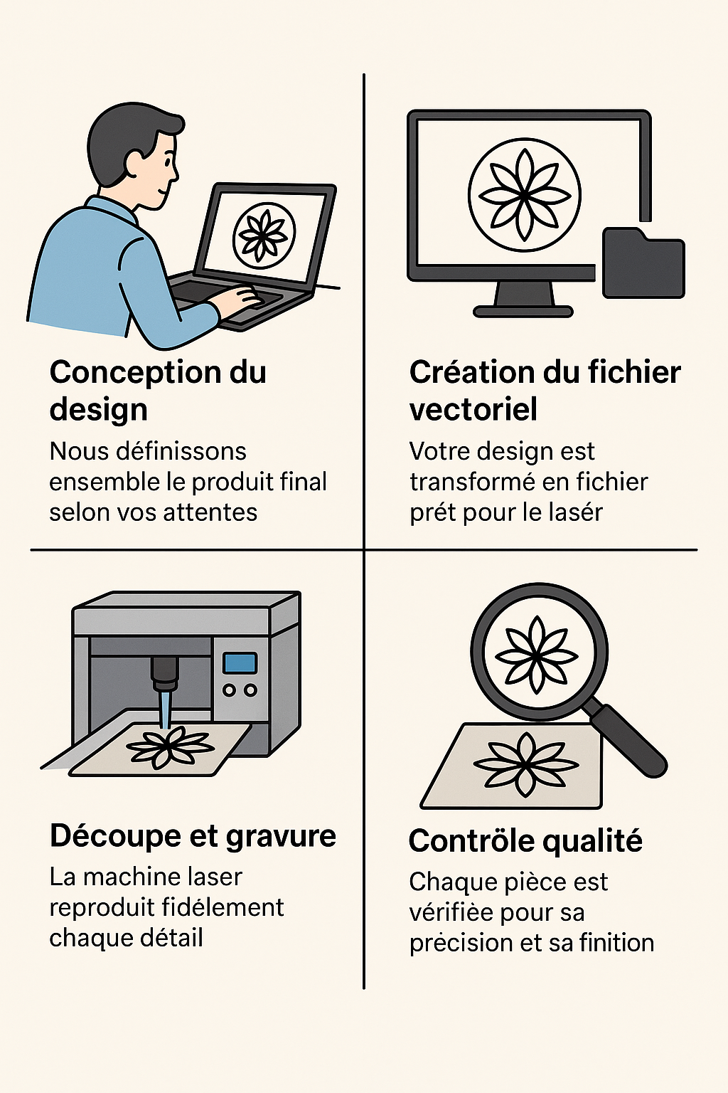 La découpe et la gravure laser offrent une précision exceptionnelle pour personnaliser vos créations.